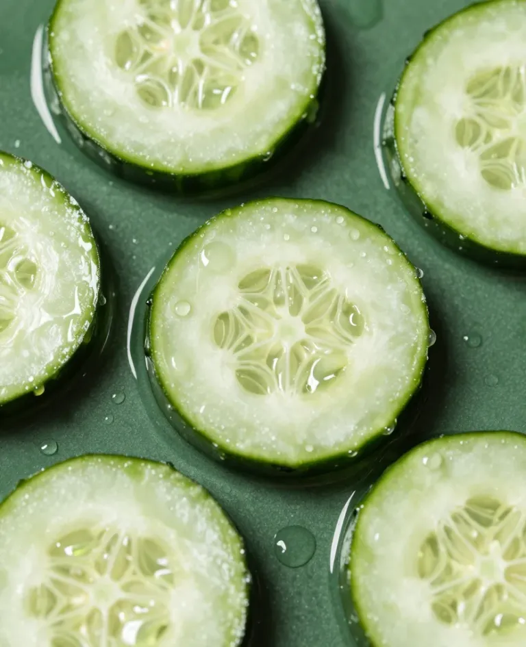 Translucent cucumber slices with visible seeds and water droplets, illuminated by soft, diffused natural light that highlights the texture and patterns. The dark, leafy background slightly blurs to emphasize the cucumber slices, creating a shallow depth of field.