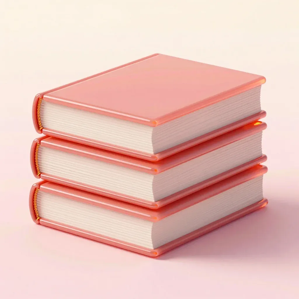 A stack of three glossy, peach-colored books with crisp white pages, softly lit from above, creating gentle shadows and highlights, set against a harmonious pastel pink background with a blurred, unobtrusive backdrop.