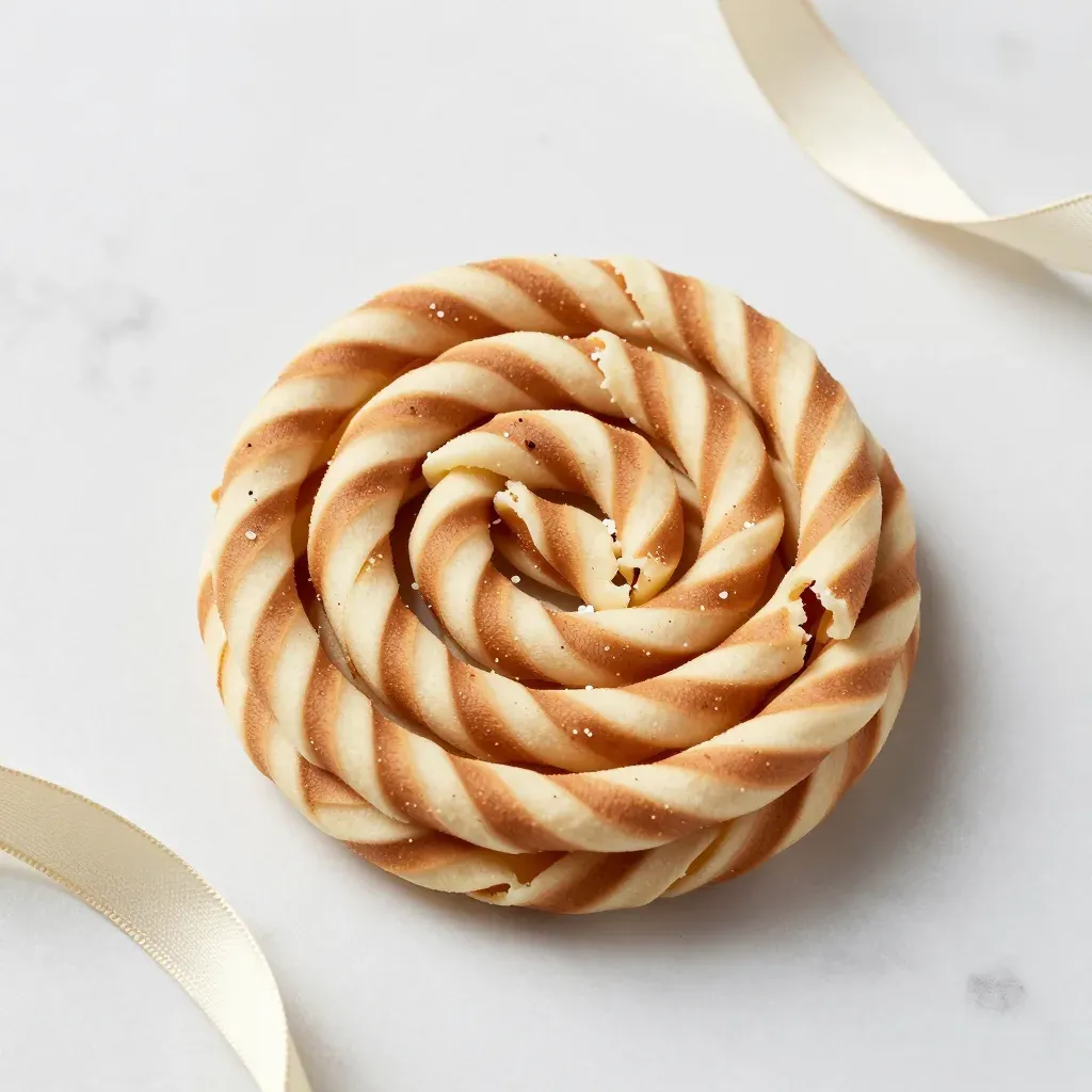 A golden-brown swirled pastry with powdered sugar, showcasing light, airy, glossy, delicate layers under soft, warm, directional lighting. The shallow depth of field and white marble background with blurred ribbon accents create a clean and elegant composition.