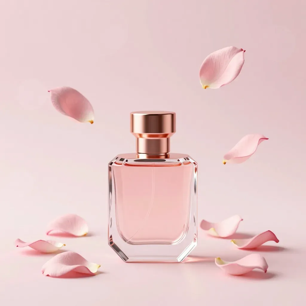 A crystal-clear perfume bottle with a rose gold cap, surrounded by floating rose petals, bathed in soft, diffused light that highlights the bottle's smooth, glossy finish and creates a sense of depth and movement against a blurred pink background.