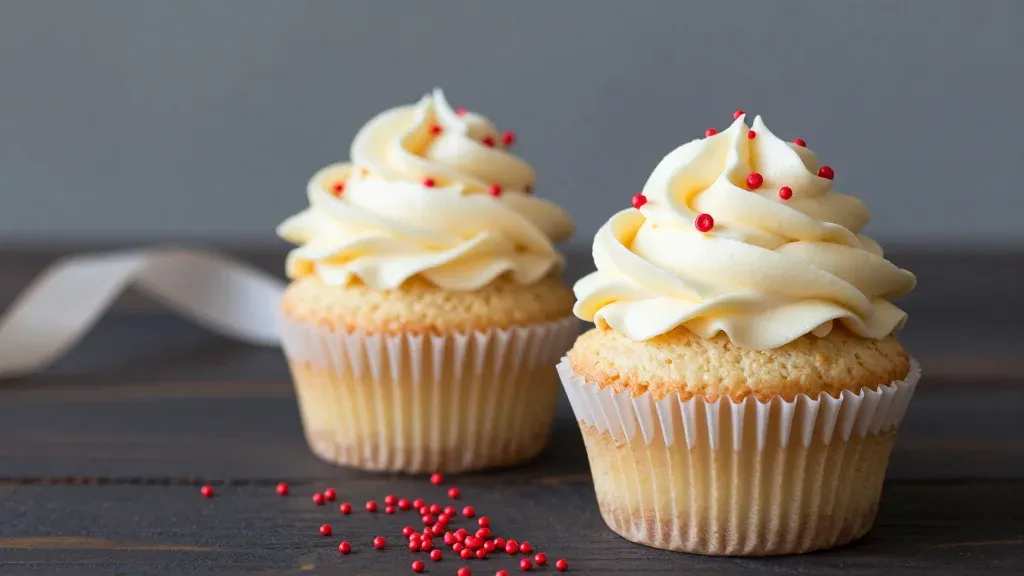 Close-up of vanilla cupcakes with smooth, glossy white frosting and red sprinkles, set against a dark wooden background with soft, diffused lighting that highlights the texture of the frosting and cake. Shallow depth of field keeps the cupcakes in sharp focus while the background is blurred, creating a clean and elegant composition.