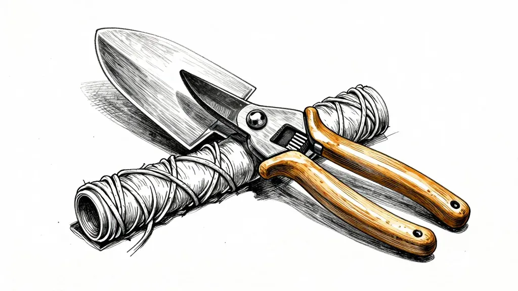 A close-up of a trowel, pruners, and shears with twine-wrapped handles, set against a plain white background. Soft, diffused lighting highlights the textures and natural wood tones of the tools, creating a balanced and clean composition.
