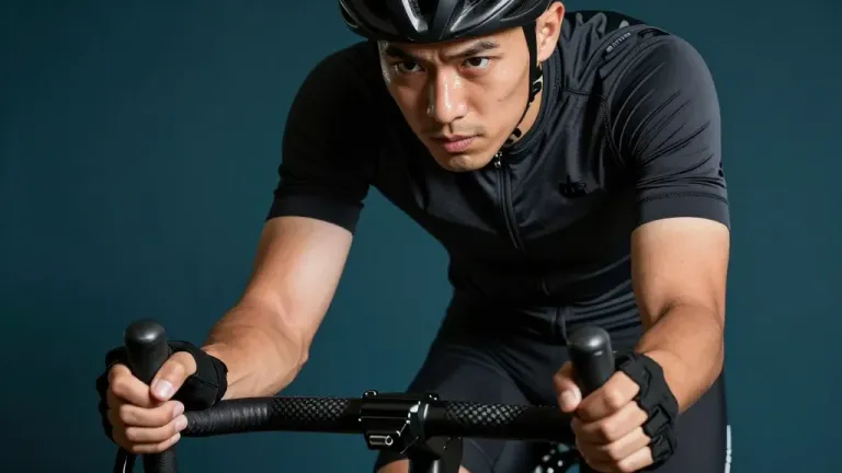 A cyclist in a dynamic pose, gripping rough handlebars, with a smooth black jersey and glossy black helmet, illuminated by soft, even lighting that highlights facial features and jersey contours. The solid teal background provides a clean, distraction-free backdrop with a shallow depth of field.