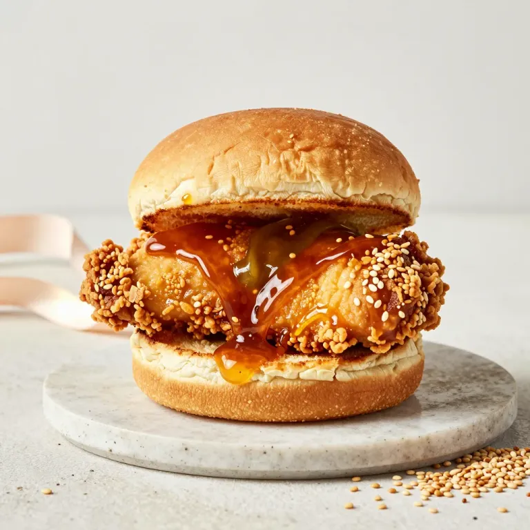 A golden-brown crispy chicken sandwich with a coarse sesame seed coating and viscous amber sauce is presented on a smooth marble platter, showcasing rich textures and warm tones. Soft diffused lighting from the upper left creates gentle highlights on the sauce and bun, while a shallow depth of field and minimalist background emphasize the subject with clean copy space.