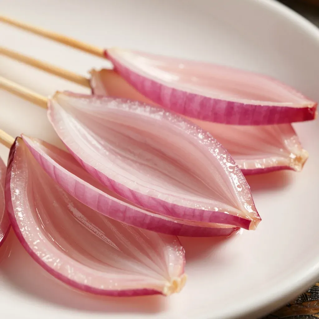 Translucent pickled onion slices glisten on skewers, softly lit to highlight their glossy texture and crisp edges. The minimalist white plate and shallow depth of field emphasize the skewers, offering a clean and focused presentation.
