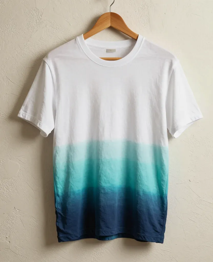 A white T-shirt with a smooth gradient dip-dye effect transitioning from aqua to navy blue, displayed on a wooden hanger against a textured beige wall. The soft, even lighting highlights the fabric's texture and the gradient's smooth transition, creating a clean and focused composition.