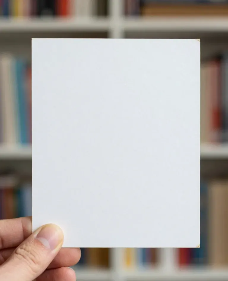 A hand gently holds a smooth, glossy white card against a softly lit, blurred bookshelf background. The diffused lighting and shallow depth of field create a clean, focused composition ideal for minimalistic design elements.