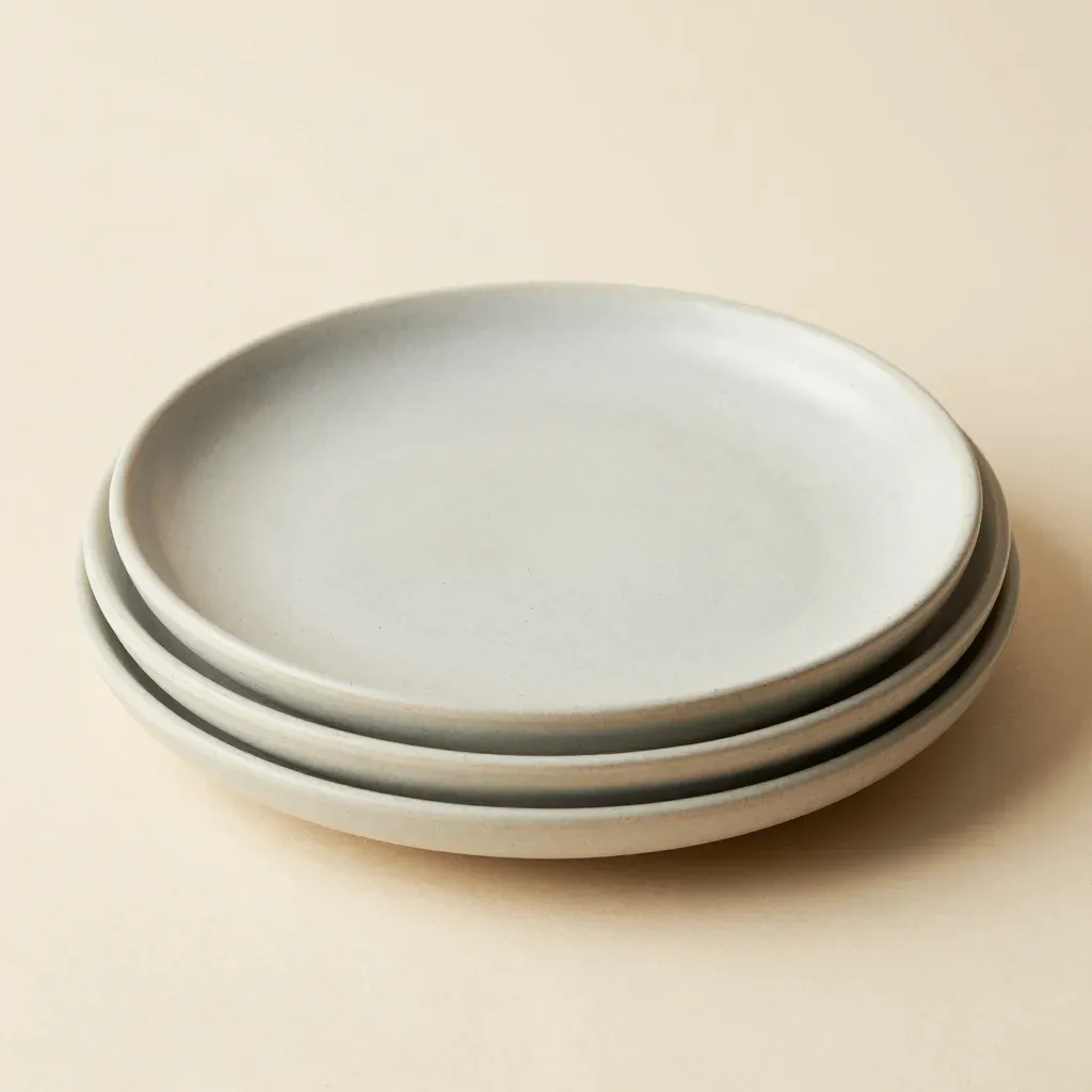 A stack of smooth, glossy ceramic plates arranged in a neat pile, illuminated by diffused, soft light that creates gentle highlights and subtle shadows, emphasizing their clean, neutral white and gray tones. The neutral beige background, blurred and out of focus, draws attention to the plates as the main subject, offering a clean and minimalistic aesthetic.