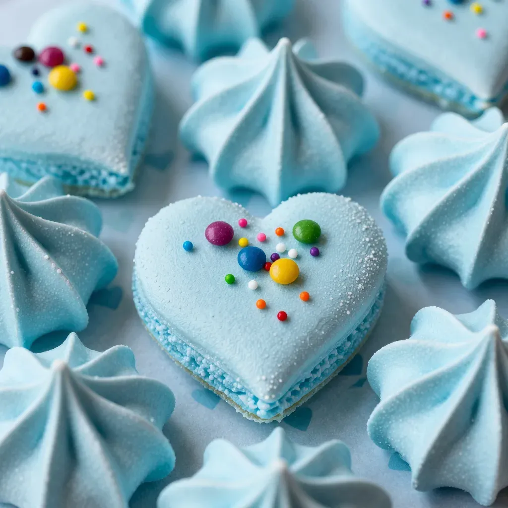 A heart-shaped meringue with glossy, soft, airy texture and colorful sprinkles, highlighted by soft, diffused lighting that enhances its texture and depth. The blurred background with other meringues creates a sense of abundance and depth, making it ideal for culinary and confectionery themes.