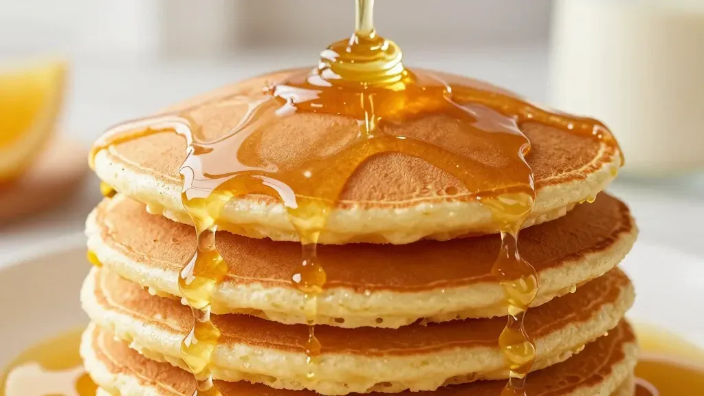 A close-up of fluffy golden pancakes drizzled with amber honey, illuminated by warm, diffused light that highlights the texture and glossy syrup, set against a clean white background with a shallow depth of field.