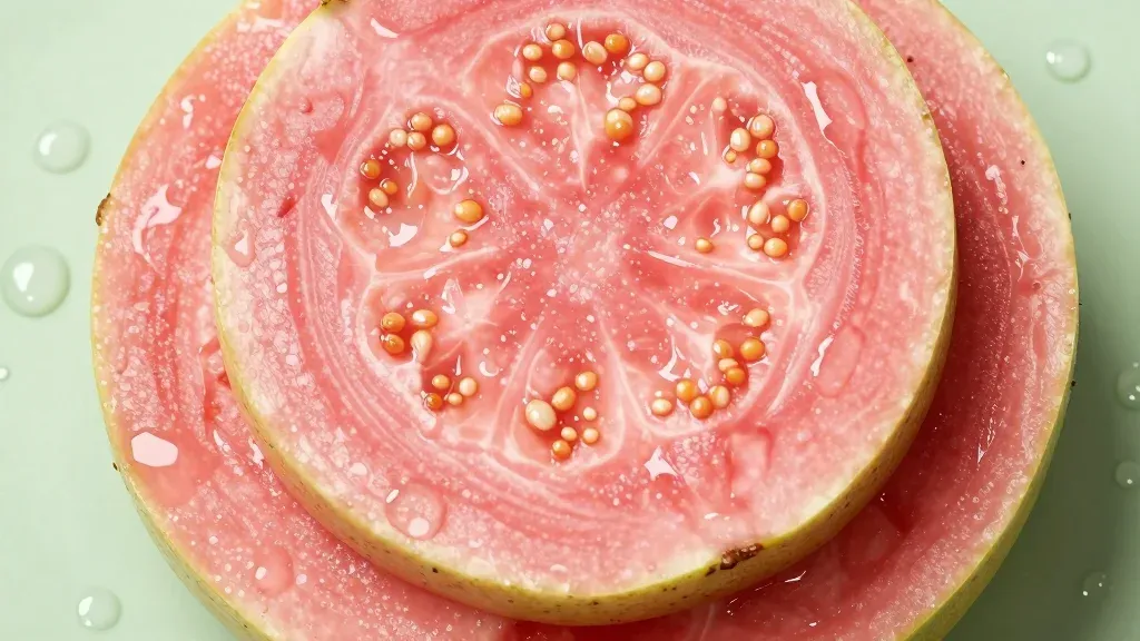 A close-up of thinly sliced guava with vibrant pink flesh and golden seeds, softly lit to highlight its natural sheen and juicy texture. The pale green background provides a clean and simple backdrop, emphasizing the fruit's freshness and natural beauty.
