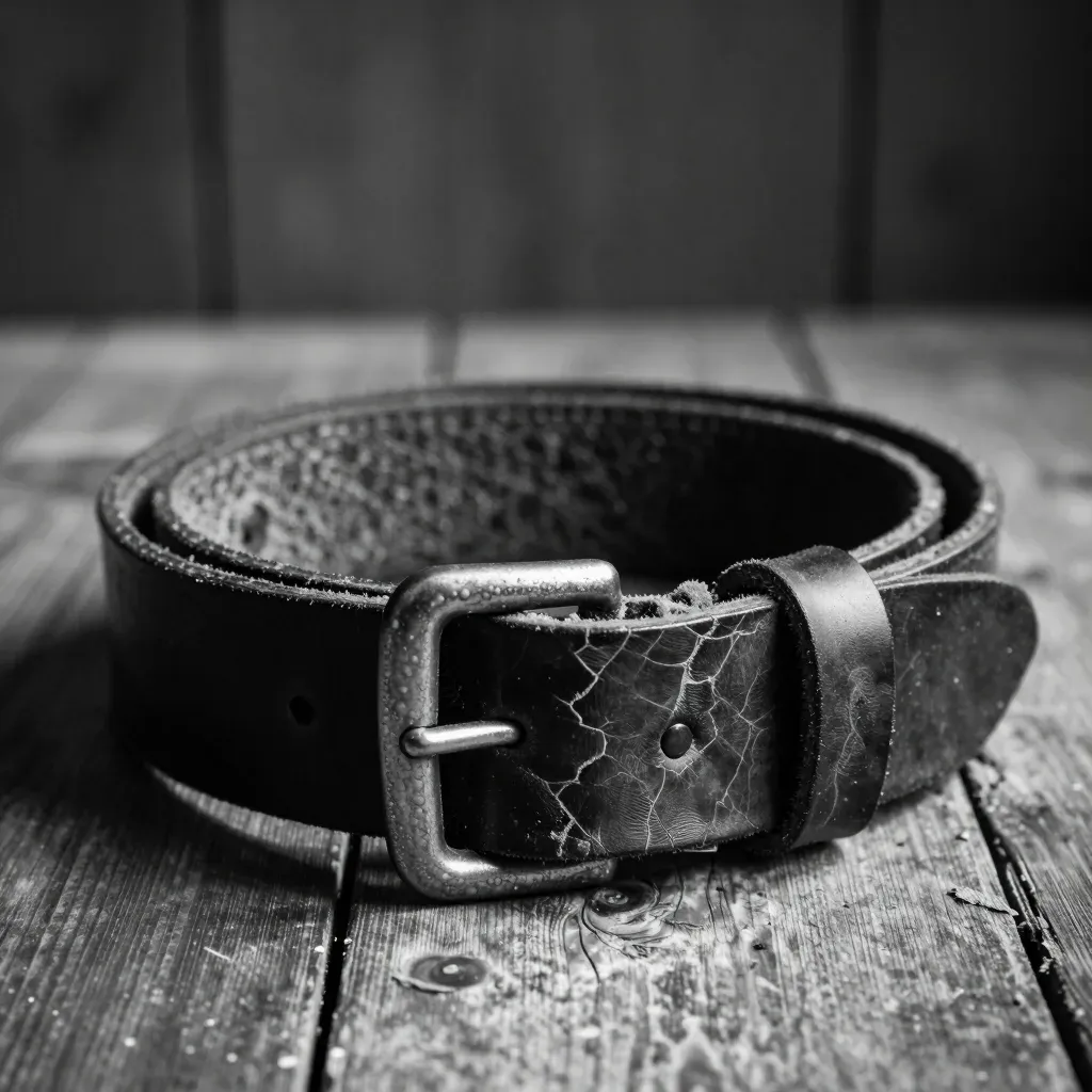 A dark, textured leather belt with visible cracks and a metallic buckle sits on a weathered wooden surface, highlighting the texture and play of light and shadow. The shallow depth of field keeps the belt sharp while the background is slightly blurred, emphasizing the rustic and natural context.