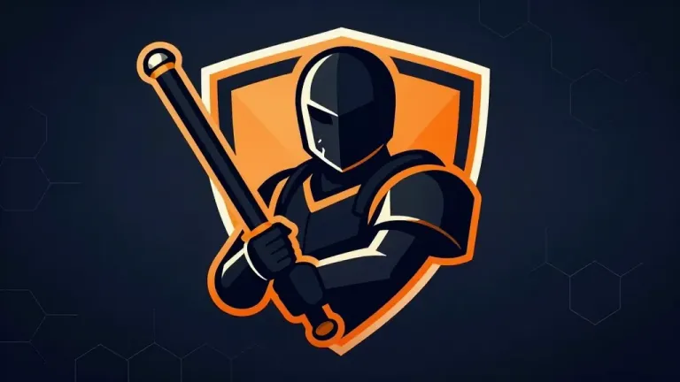 A cyber-sentinel in a glossy black suit and reflective helmet holds a metallic sword, illuminated by directional light from above, creating sharp highlights and deep shadows. The hexagonal background, slightly blurred, adds depth and focus to the subject.