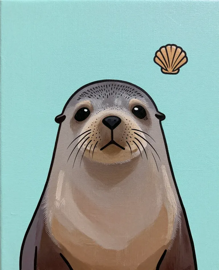 A seal with soft, plush-like fur and delicate whiskers, highlighted by soft, even lighting, sits centered against a light teal background with a floating beige seashell above. The minimalistic composition and slightly blurred background provide ample copy space for various design applications.