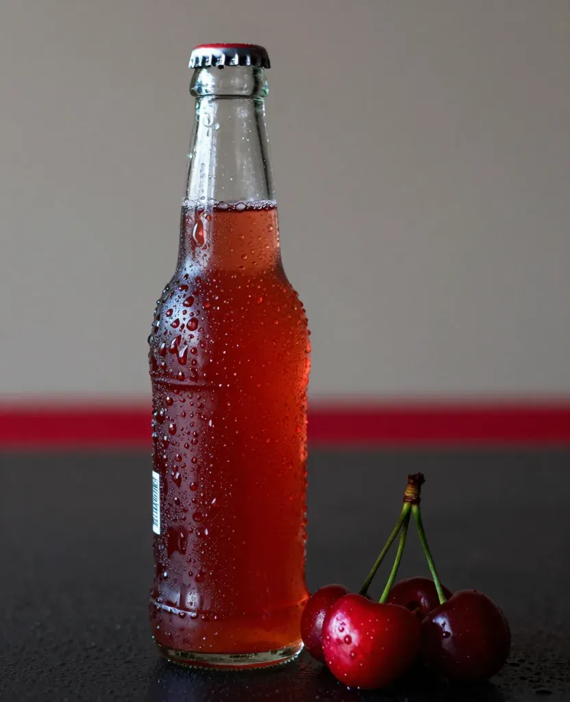 A glass bottle of cherry soda with visible condensation droplets stands beside two glossy fresh cherries, their waxy skins reflecting soft light. The shallow depth of field and low-angle perspective emphasize the bottle’s height against a clean, blurred background with a bold red stripe.