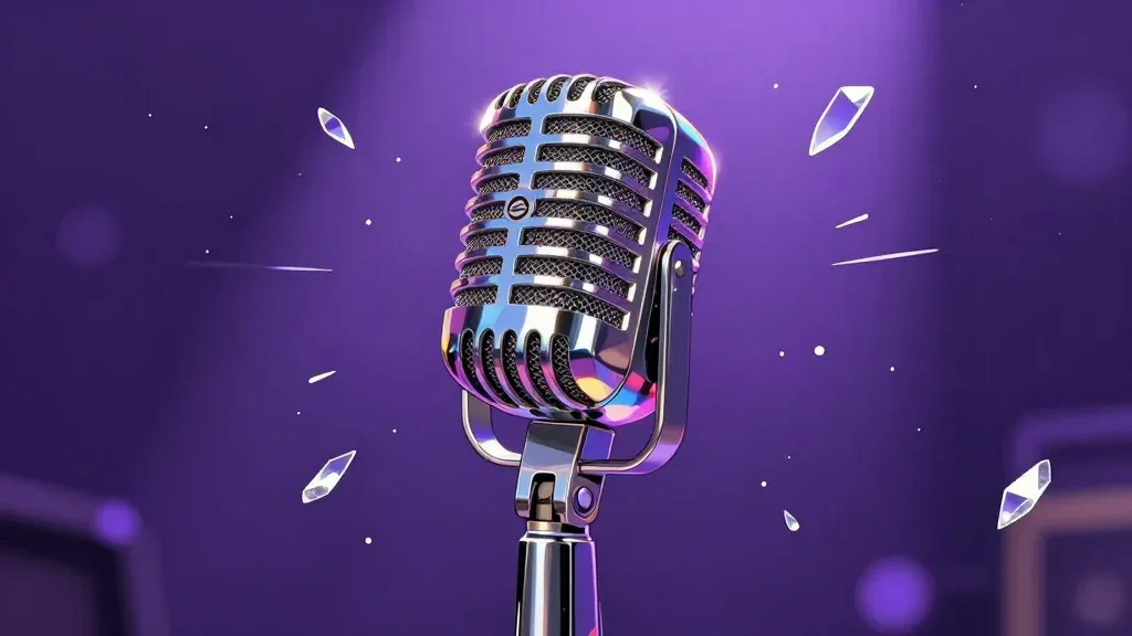 A vintage microphone with intricate grille and polished chrome body, illuminated by directional lighting that creates reflections and soft bokeh lights in the background. The floating crystals add a dynamic and ethereal quality to the composition, emphasizing the microphone as the central focus against a deep purple stage setting.