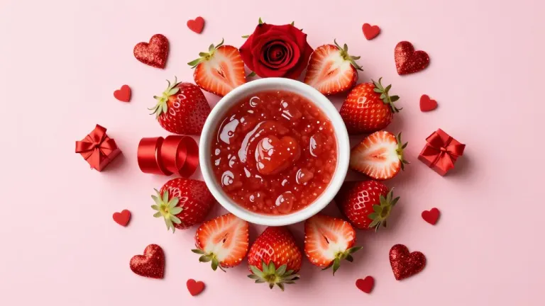 A smooth, glossy strawberry coulis in a white bowl is surrounded by rough, juicy strawberries and delicate rose petals, all set against a soft, diffused light that highlights the vibrant red hues. The balanced composition and scattered background elements create a visually appealing and elegant presentation.