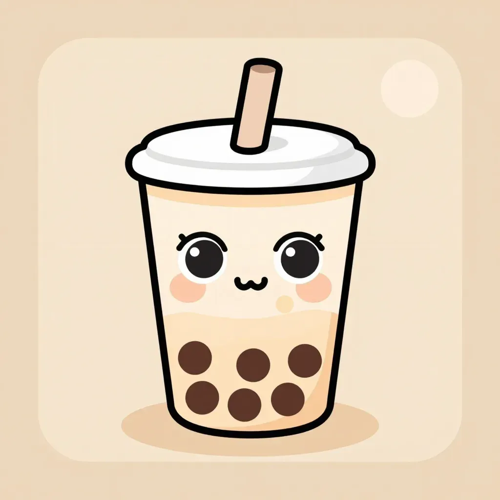 A cute, anthropomorphic bubble tea cup with large eyes and a smiling face, featuring soft tapioca pearls and a wooden straw, set against a soft, diffused light that highlights its glossy surface and creates gentle shadows. The light beige background provides a neutral backdrop, keeping the focus on the cup's charming details.
