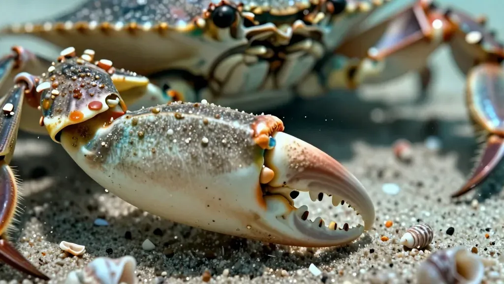 A close-up of a crab's glossy claw against a backdrop of rough sand grains and fine hairs, illuminated by soft, diffused light that highlights the texture and creates subtle shadows. The shallow depth of field blurs the background, emphasizing the subject.