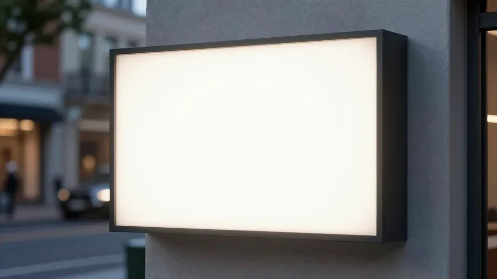 A glowing rectangular lightbox is mounted on a corner wall with a rough, plaster-like texture, casting a warm, diffused light that creates a soft glow and gentle shadows. The blurred urban street background with soft, warm lighting from storefronts adds depth and context to the scene.