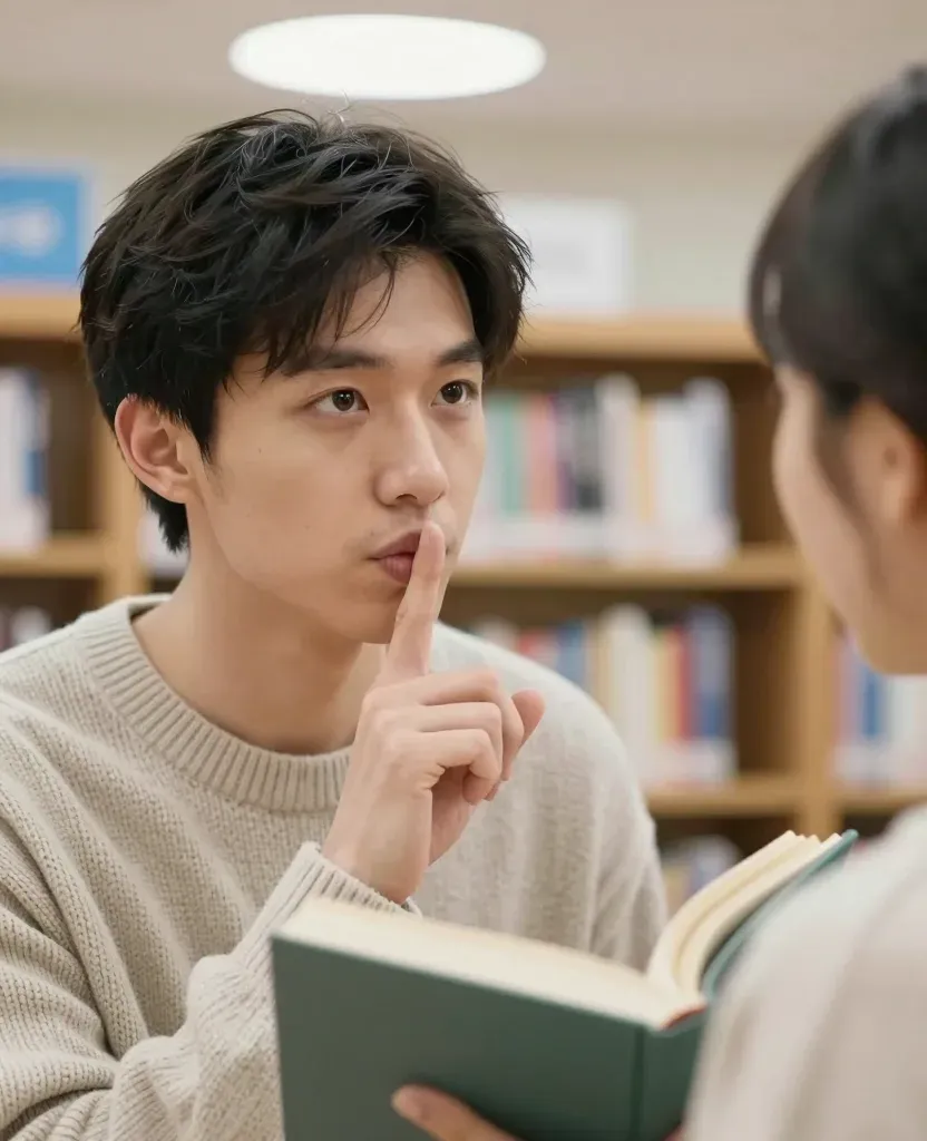 A young man, dressed in a beige sweater, holds a book with his fingers pressed to his lips, signaling silence. Soft, diffused lighting highlights his face and the glossy book pages, creating a serene and focused atmosphere in the library setting.