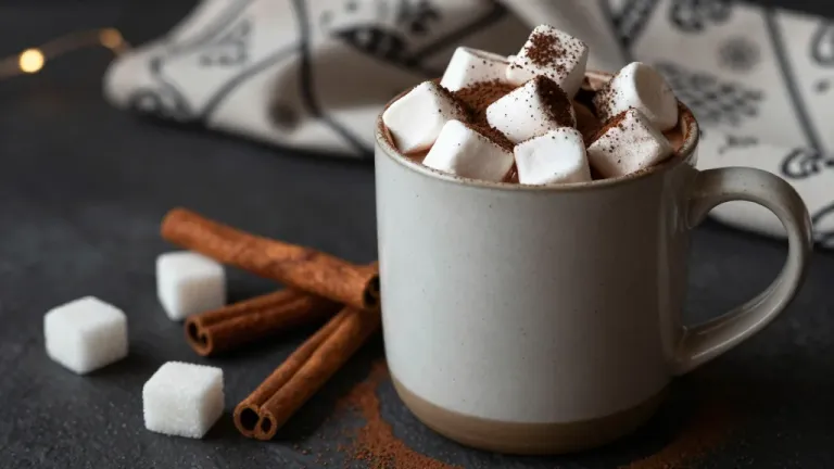 A steaming mug of hot cocoa topped with fluffy marshmallows and dark chocolate shavings, bathed in soft, warm light that highlights the glossy cocoa surface and fluffy marshmallows. The close-up shot and shallow depth of field create a sense of depth and focus on the mug, with cinnamon sticks and sugar cubes arranged around it on a dark gray background.