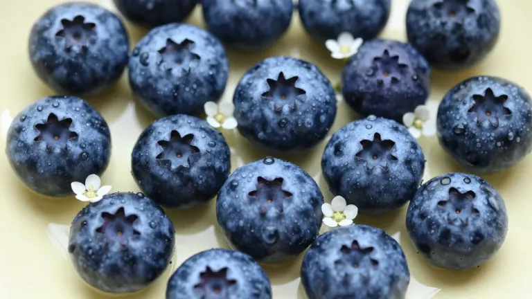 A cluster of plump, glossy blueberries with delicate white blossoms scattered throughout, showcasing their waxy skin and fine surface dimples. Soft, diffused overhead lighting creates gentle highlights and shallow depth of field, with a smooth, out-of-focus pale yellow-beige background emphasizing the subject.