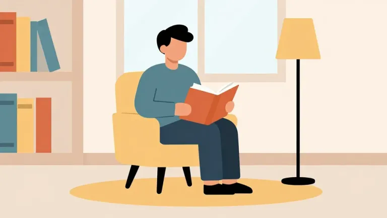 A man sits comfortably in a plush armchair, engrossed in a glossy book, illuminated by warm ambient light from a soft lampshade. The cozy living room setting, with bookshelves and a side table, enhances the serene and inviting atmosphere.