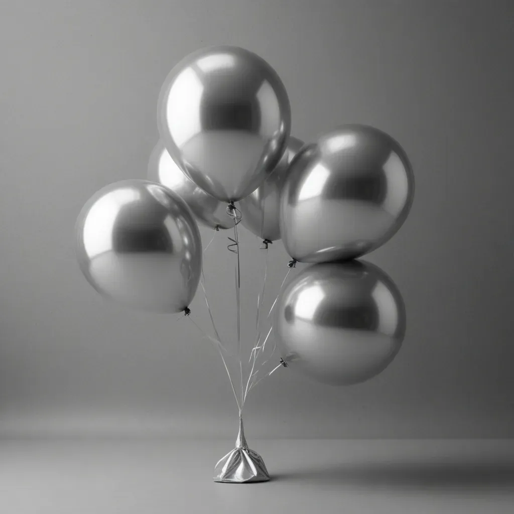 A cluster of glossy, metallic silver balloons arranged in a balanced, slightly off-center composition, softly illuminated from above, creating highlights and reflections. The neutral gradient background enhances the balloons' reflective surfaces, providing ample copy space for design integration.