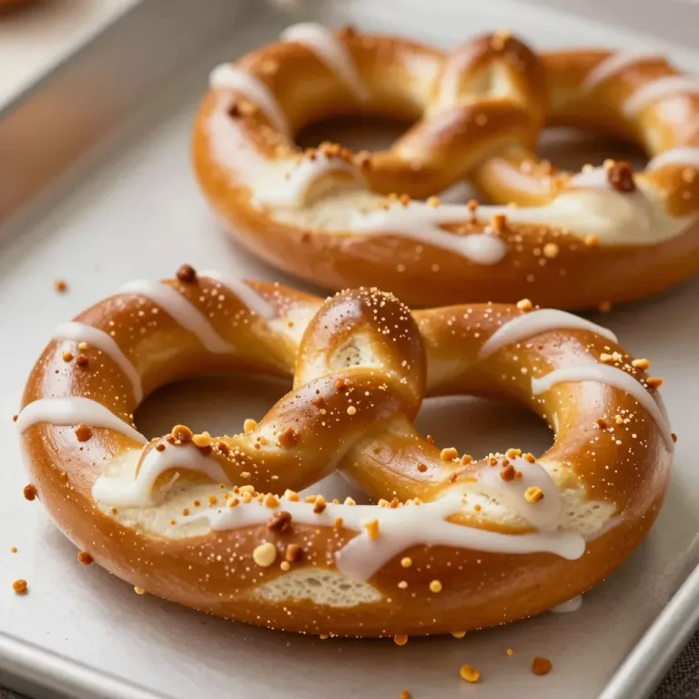Golden-brown pretzels are drizzled with glossy white icing and sprinkled with coarse salt, highlighted by soft, diffused lighting that accentuates their texture and color. The shallow depth of field keeps the focus on the pretzels against a blurred, neutral background.