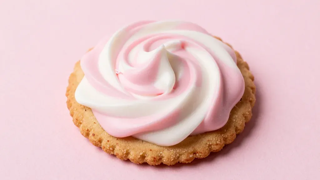 A close-up of a cookie topped with a swirl of pink and white cream, illuminated by a top-down light source that creates soft shadows and highlights on the cream, set against a clean pink background that enhances the subject's visual appeal.
