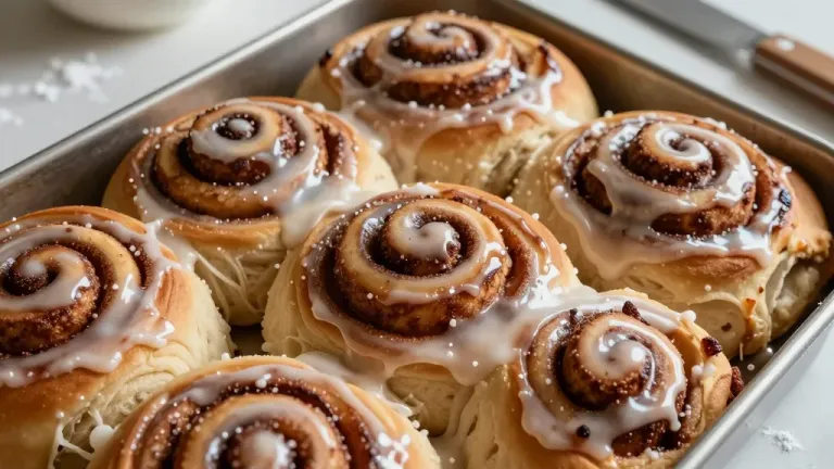 A close-up of a pan of golden-brown cinnamon rolls with a glossy white icing and sprinkled sugar, illuminated by soft, overhead light that highlights the textures and creates a shallow depth of field, emphasizing the rolls against a clean white background.