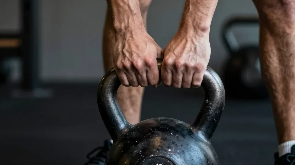 Rough, calloused hands with white chalk grip the metallic handle of a kettlebell, highlighting the texture and soft, diffused lighting. The shallow depth of field and blurred gym background emphasize the subject, creating a focused and dynamic composition.