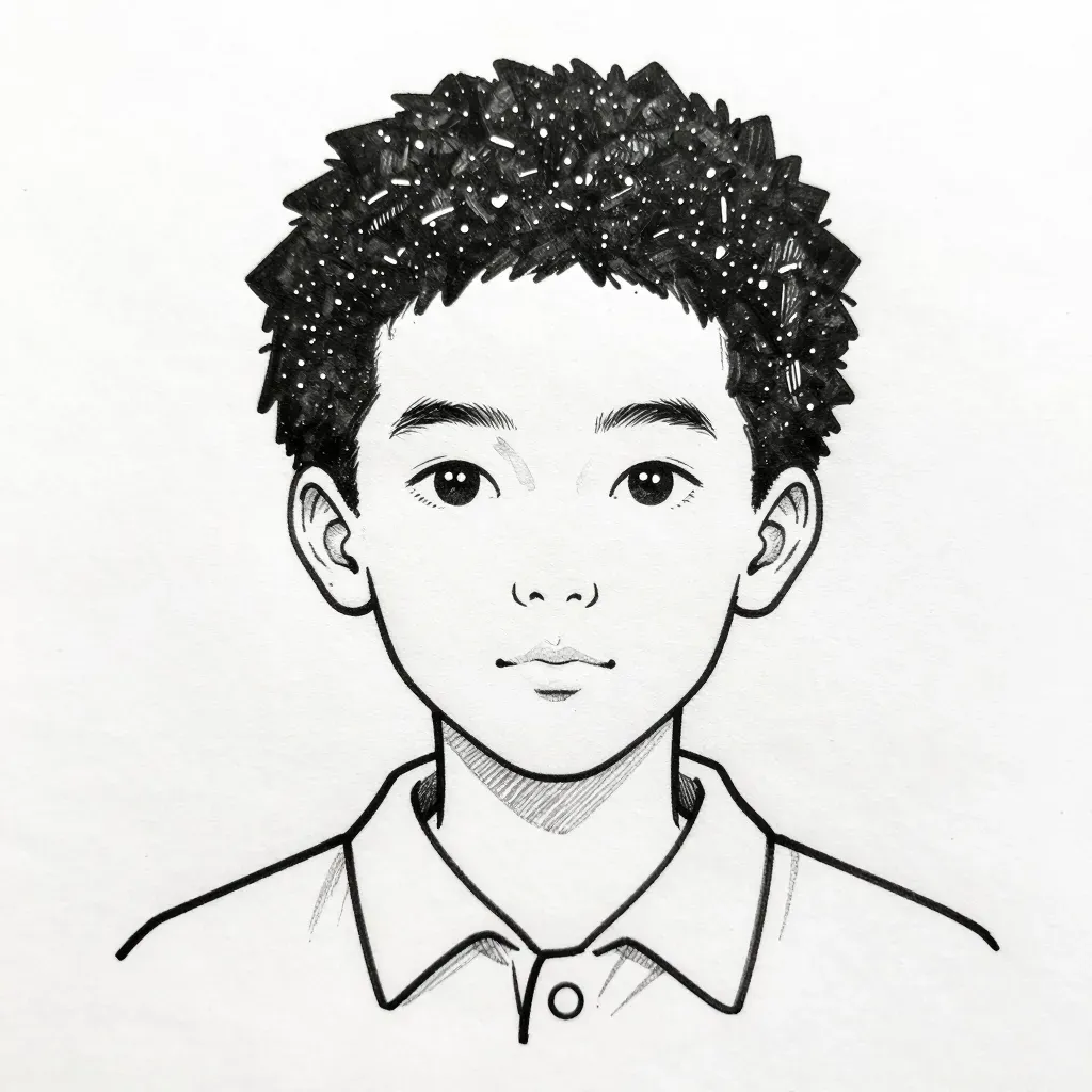 A young boy with a textured, spiky hairstyle is depicted in a close-up portrait, illuminated by soft, diffused light that highlights the contours of his face and hair. The plain white background ensures no distractions, making the subject the focal point of the image.