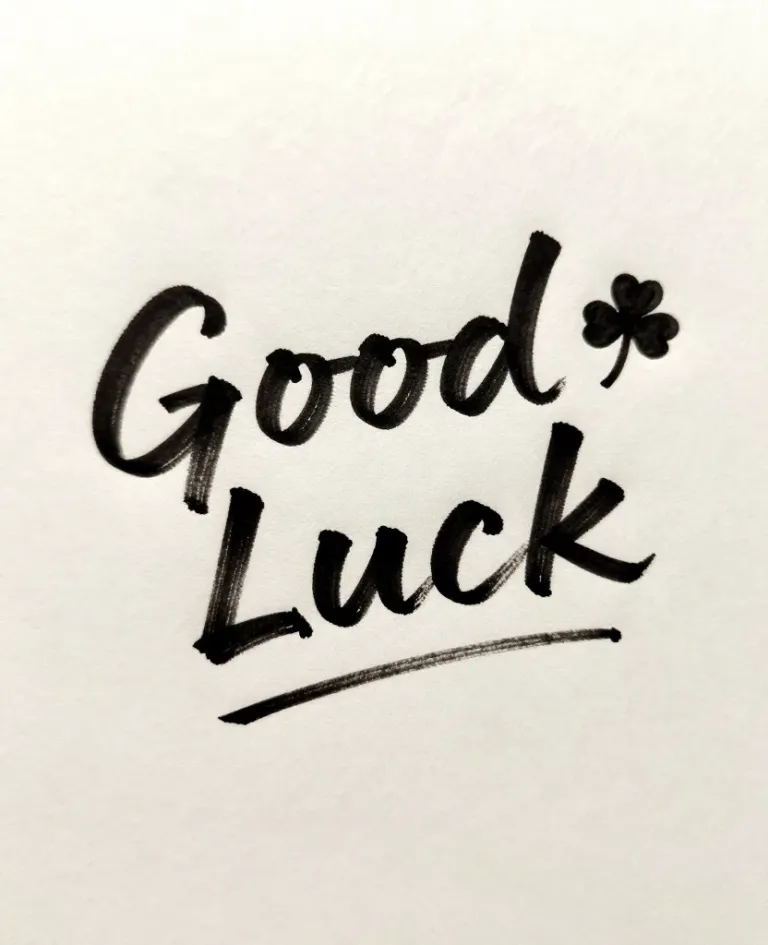 A handwritten 'Good Luck' message with a four-leaf clover, set against a smooth paper texture with soft, diffused lighting. The centered composition and clean white background provide ample copy space for various design applications.