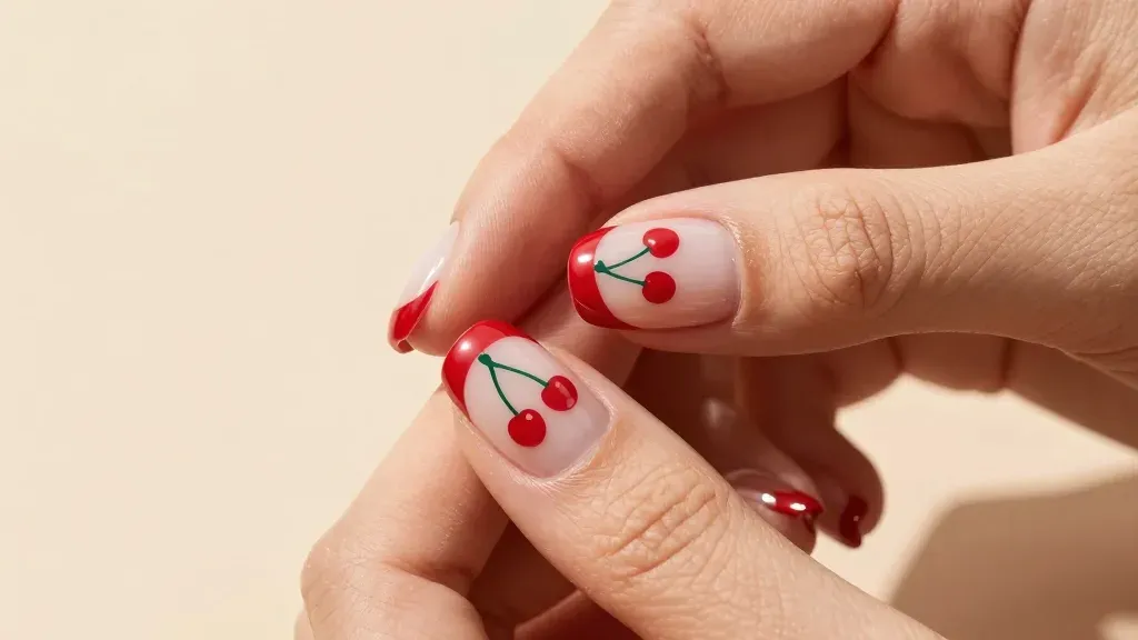 A hand displays a French manicure with glossy red cherries, set against a soft, diffused light that highlights the glossy finish and creates gentle shadows. The neutral beige background provides a clean and unobtrusive backdrop, emphasizing the manicure's details.