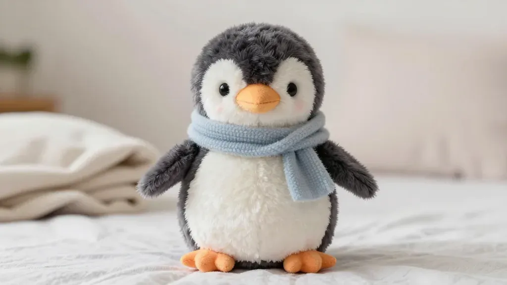 A soft, plush penguin adorned with a knitted scarf sits on a cozy blanket, bathed in soft, diffused light that highlights its textures and creates gentle shadows. The composition is centered, with ample copy space, ideal for product or lifestyle imagery.