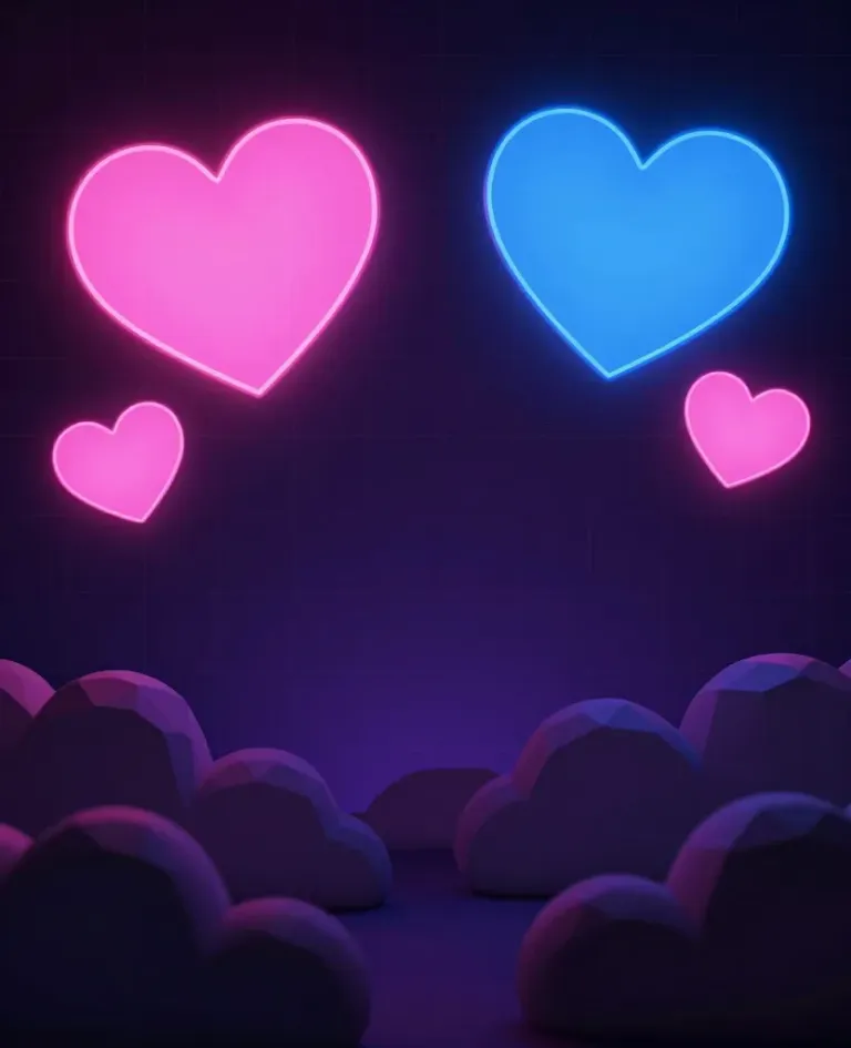 Two glowing neon hearts (pink and blue) float above soft, cloud-like shapes, casting a soft glow on the dark, moody sky. The composition is balanced and harmonious, with a grid-like background adding depth and space.