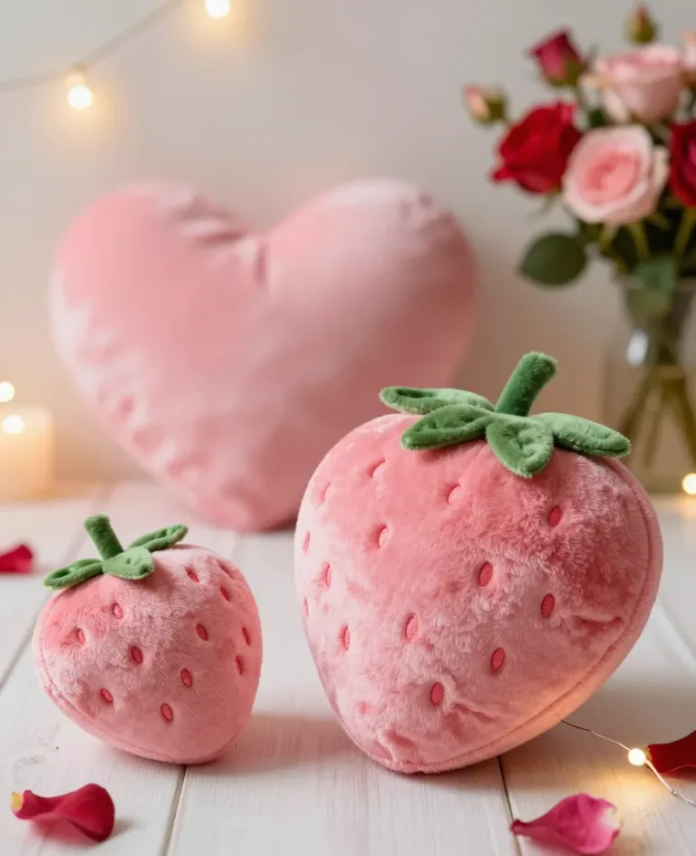 Soft, velvety plush strawberry cushions create a cozy display with warm, ambient lighting and a blurred background of roses and petals. The symmetrical composition and shallow depth of field highlight the cushions' textures and colors, making it ideal for interior design and product photography.