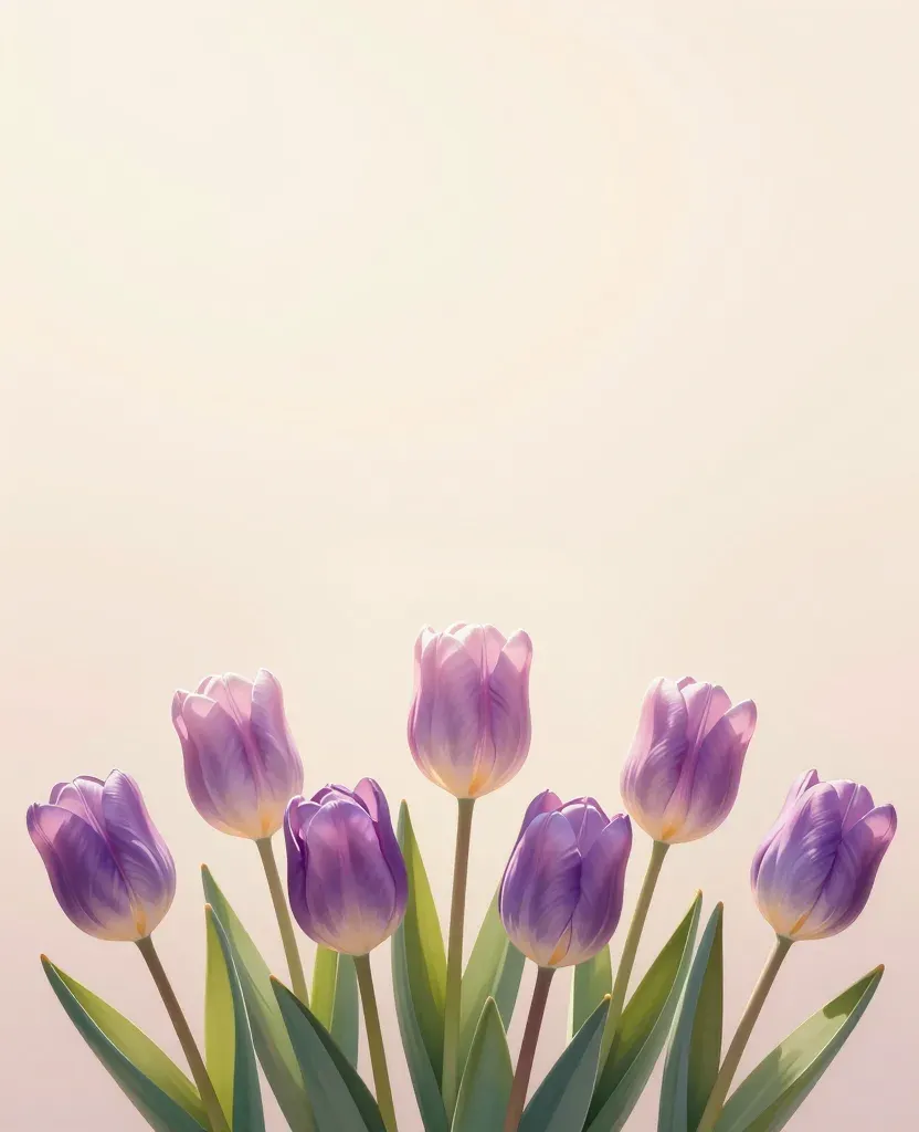 Soft lavender tulips with velvety petals and glossy sheen, bathed in diffused light from above, creating gentle highlights and shadows. The clean, uncluttered background and shallow depth of field provide ample copy space for design integration.