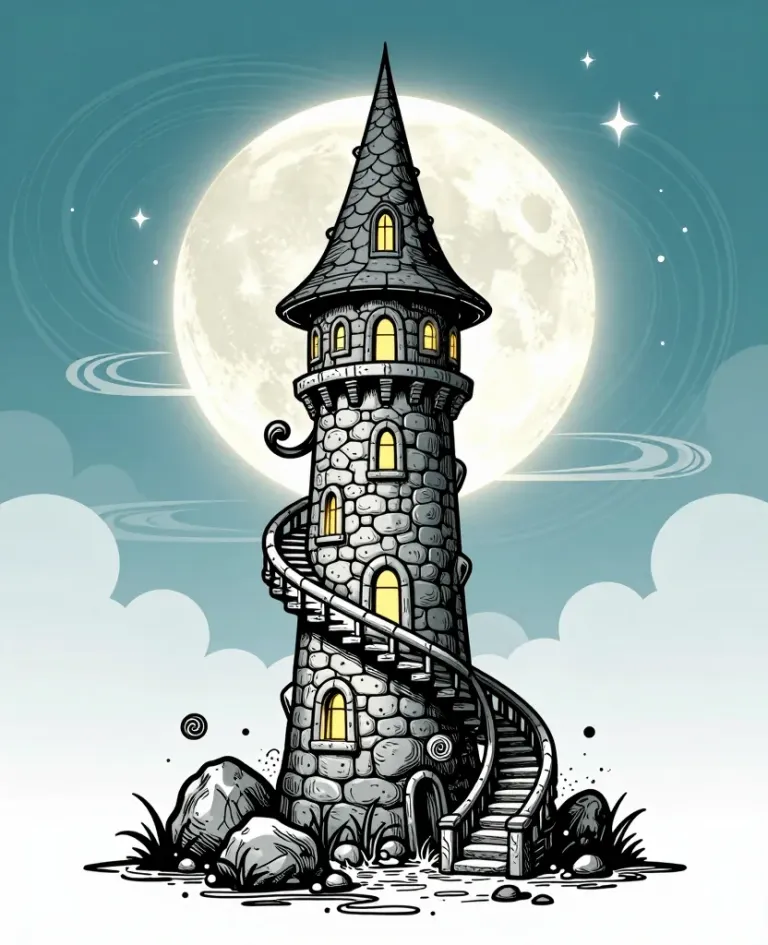 A glowing spiral staircase winds up a stone tower under a full moon, casting a soft, ethereal glow. The composition draws the eye up the tower, creating a sense of depth and mystery.