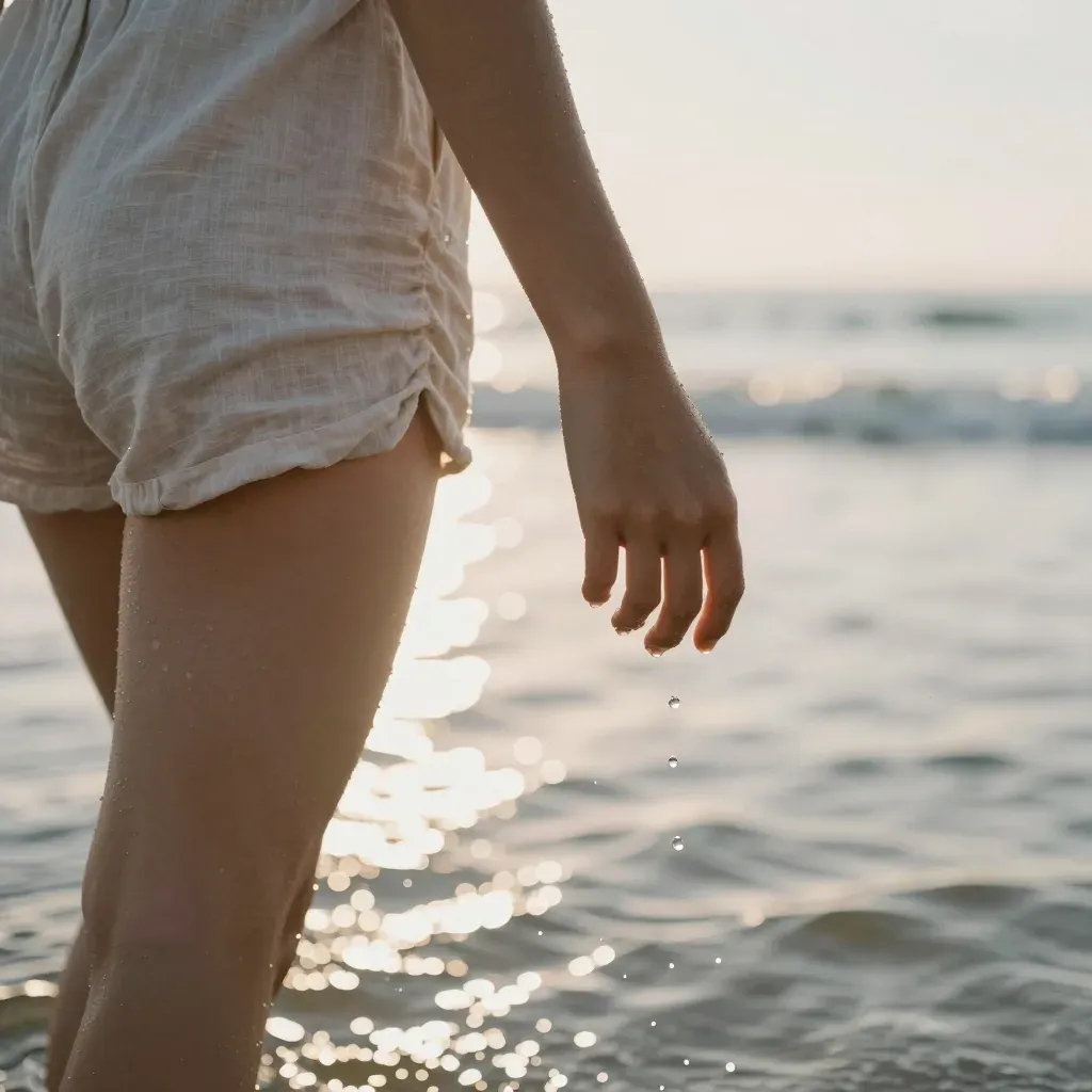 A close-up of a hand and legs emerging from the water, with warm golden sunlight reflecting off the surface, creating a bokeh effect. The shallow depth of field blurs the background, emphasizing the serene and reflective mood of the scene.