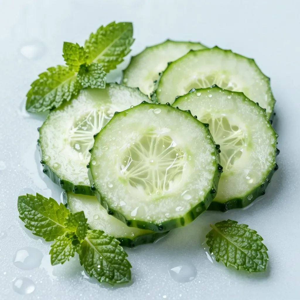Freshly sliced cucumbers and mint leaves arranged in a circular pattern, illuminated by soft, diffused light that highlights their crisp textures and vibrant green hues, creating a refreshing and inviting composition.