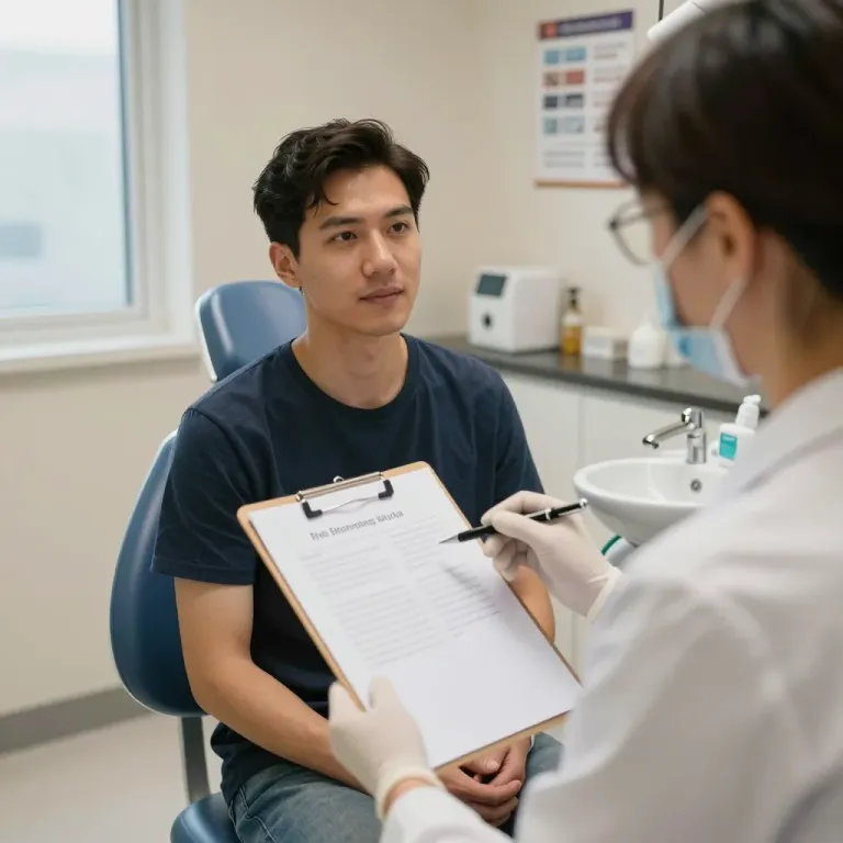 A patient is engaged in a discussion with a healthcare professional, holding a clipboard with printed text. Soft, diffused light from the window creates a calm and professional ambiance, with the background slightly blurred to emphasize the interaction between the patient and the professional.