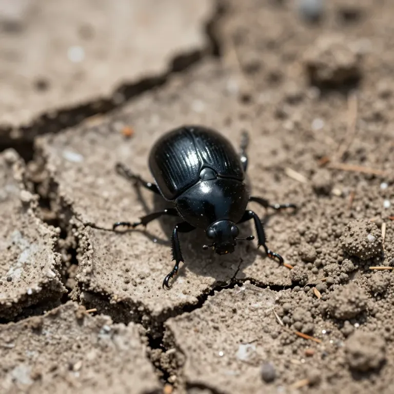 A glossy black beetle crawls across dry, cracked earth under direct sunlight, creating sharp shadows and highlighting the beetle's reflective shell. The shallow depth of field blurs the background, focusing attention on the beetle's intricate details and the texture of the soil.