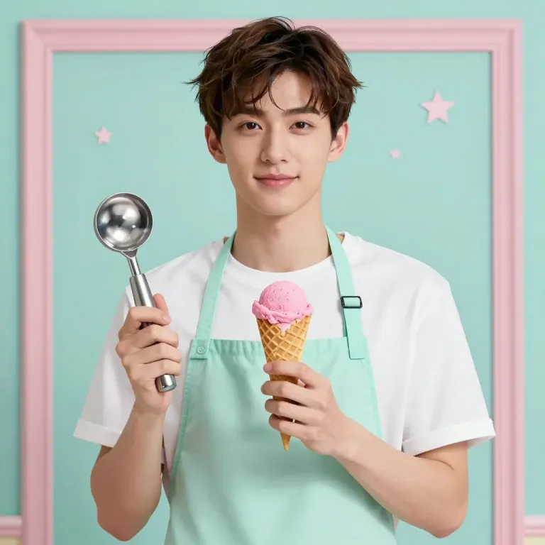 A young individual in a white t-shirt and mint green apron holds an ice cream scoop and a cone, showcasing a smooth, creamy pink ice cream against a pastel blue background with pink star accents. The soft, diffused lighting highlights the subject and ice cream texture, creating a clean and focused composition.