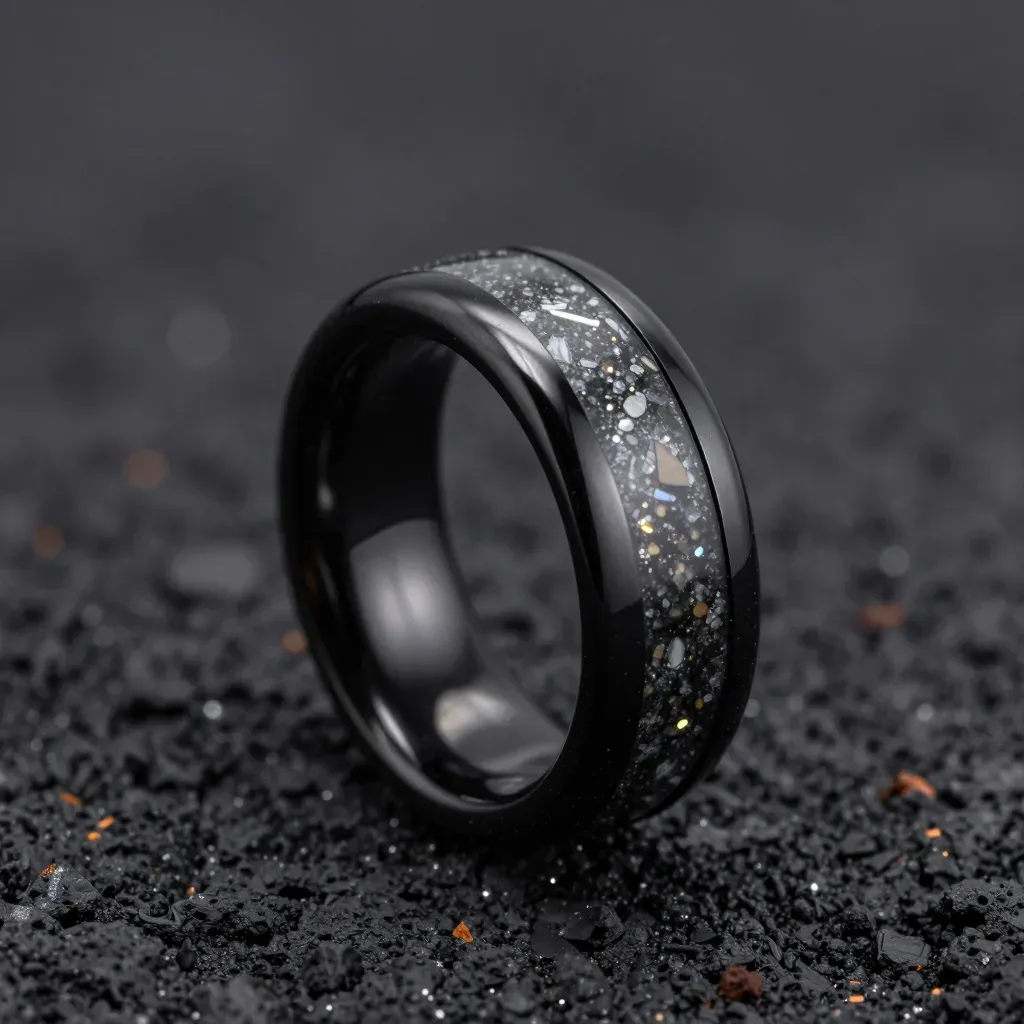 A high-gloss black ceramic ring with a granular meteorite inlay is angled diagonally, showcasing its reflective surface and crystalline speckles. Directional lighting from the upper left creates a bright highlight along the top curve and deep shadow on the lower inner edge, while a shallow depth of field isolates the ring against a dark, textured background with scattered orange-brown flecks.