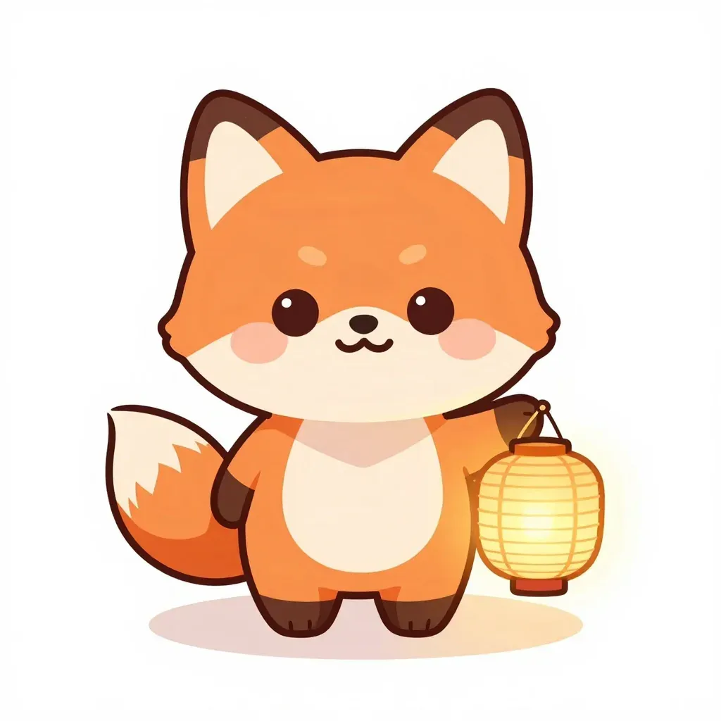 A soft, fluffy cartoon fox holds a glowing lantern, casting a warm, inviting light. The minimalist background ensures the focus remains on the fox and lantern, creating a balanced and harmonious composition.