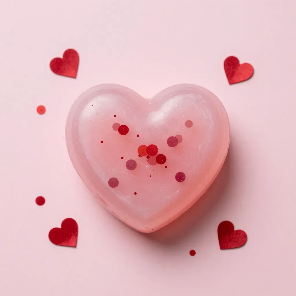 A translucent, glossy heart-shaped soap with red and orange speckles, softly lit from above, creating highlights and reflections, set against a clean, soft pink background that enhances the soap's vibrant colors and smooth texture.