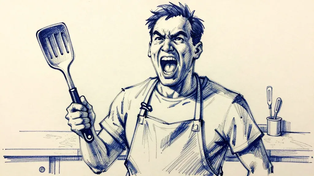 A man in a kitchen, gripping a spatula and knife with a scream, his clothing and utensils detailed with textures and lighting that highlight the intensity of the scene. The cluttered kitchen counter in the background, slightly blurred, keeps the focus on the man's dramatic expression and the sharp utensils.